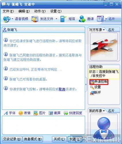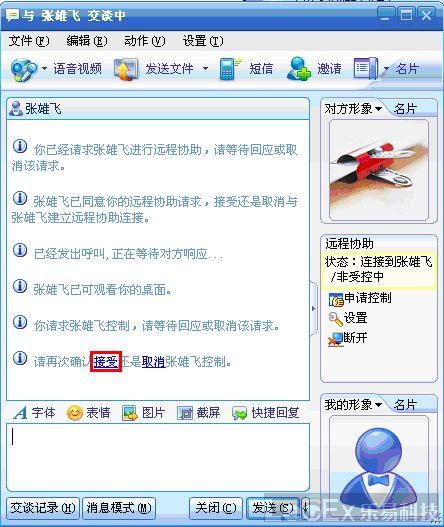 首先登陸TM,然后找到發(fā)送遠(yuǎn)程協(xié)助的TM好友,雙擊該好友的TM頭像,打開(kāi)聊天對(duì)話框,在對(duì)話框的正上方,有一排文字菜單,單擊其中的“應(yīng)用”菜單,在顯示出來(lái)的子菜單中單擊“遠(yuǎn)程協(xié)助”即向該好友發(fā)送了遠(yuǎn)程協(xié)助的請(qǐng)求。 接下來(lái)只要等待對(duì)方確認(rèn),當(dāng)對(duì)方接受遠(yuǎn)程協(xié)助的請(qǐng)求后,TM會(huì)再次要求你確認(rèn)是否接受對(duì)方為你遠(yuǎn)程協(xié)助,點(diǎn)接受即可。 然后,當(dāng)提示“某某某已可觀看您的桌面。”時(shí),單擊聊天對(duì)話框右側(cè)的申請(qǐng)控制,等待對(duì)方確認(rèn)后,再次點(diǎn)擊接受,即完成了整個(gè)遠(yuǎn)程協(xié)助的發(fā)起,接下來(lái)就是該好友為你遠(yuǎn)程協(xié)助處理問(wèn)題。 流程圖如下: 第一步:?jiǎn)?dòng)TM,并且找到需要發(fā)送遠(yuǎn)程協(xié)助的好友TM,雙擊打開(kāi)聊天對(duì)話框