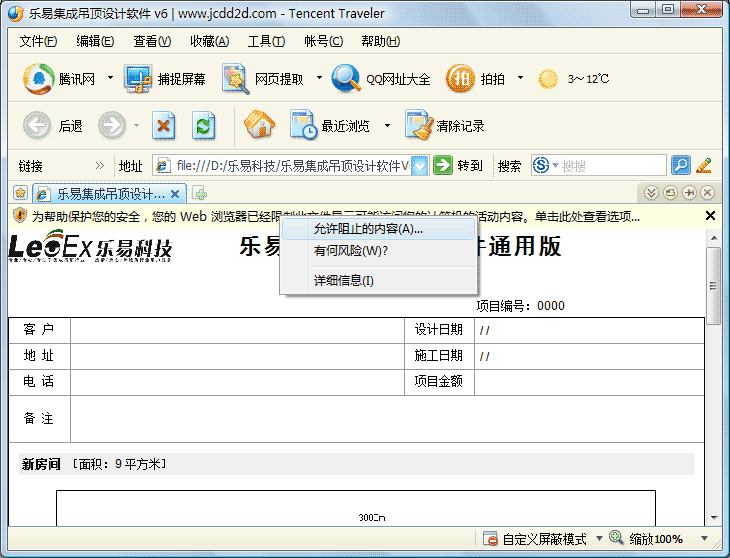 最近,經(jīng)常有一些經(jīng)銷商帶著些許疑惑來(lái)詢問(wèn)我們同一個(gè)問(wèn)題,打印時(shí)總會(huì)有一個(gè)安全提示,這個(gè)是不是代表我們的軟件中病毒了。 其實(shí),大家完全可以放心,不是中病毒了,只是軟件提供的一個(gè)新功能,需要安裝。 具體操作: 1、圖紙?jiān)O(shè)計(jì)完成后,點(diǎn)打; 2、在彈出的頁(yè)面上右鍵點(diǎn)擊控件安裝的提示,選擇“允許阻止的內(nèi)容”; 3、點(diǎn)擊彈出的“安裝對(duì)話框”,選擇“是”; 4、把鼠標(biāo)移動(dòng)到網(wǎng)頁(yè)中的圖紙上,使用鼠標(biāo)滾輪即可控制圖紙大小,調(diào)整好后,即可打印。 如圖: