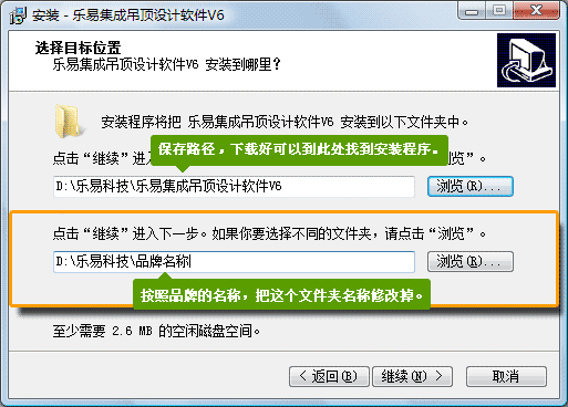 藥方: 1、將桌面上已安裝的軟件快捷啟動(dòng)方式的名稱按照代理的品牌名稱修改,如品牌名稱為“樂易集成”則如下圖修改 2、通過m.shjiege.com重新下載安裝程序,安裝V6軟件,在選擇安裝路徑時(shí),請(qǐng)按下圖所示修改 通過以上操作,用戶即可在保留通用版軟件的前提下,重新安裝上自己所代理的品牌軟件。 |